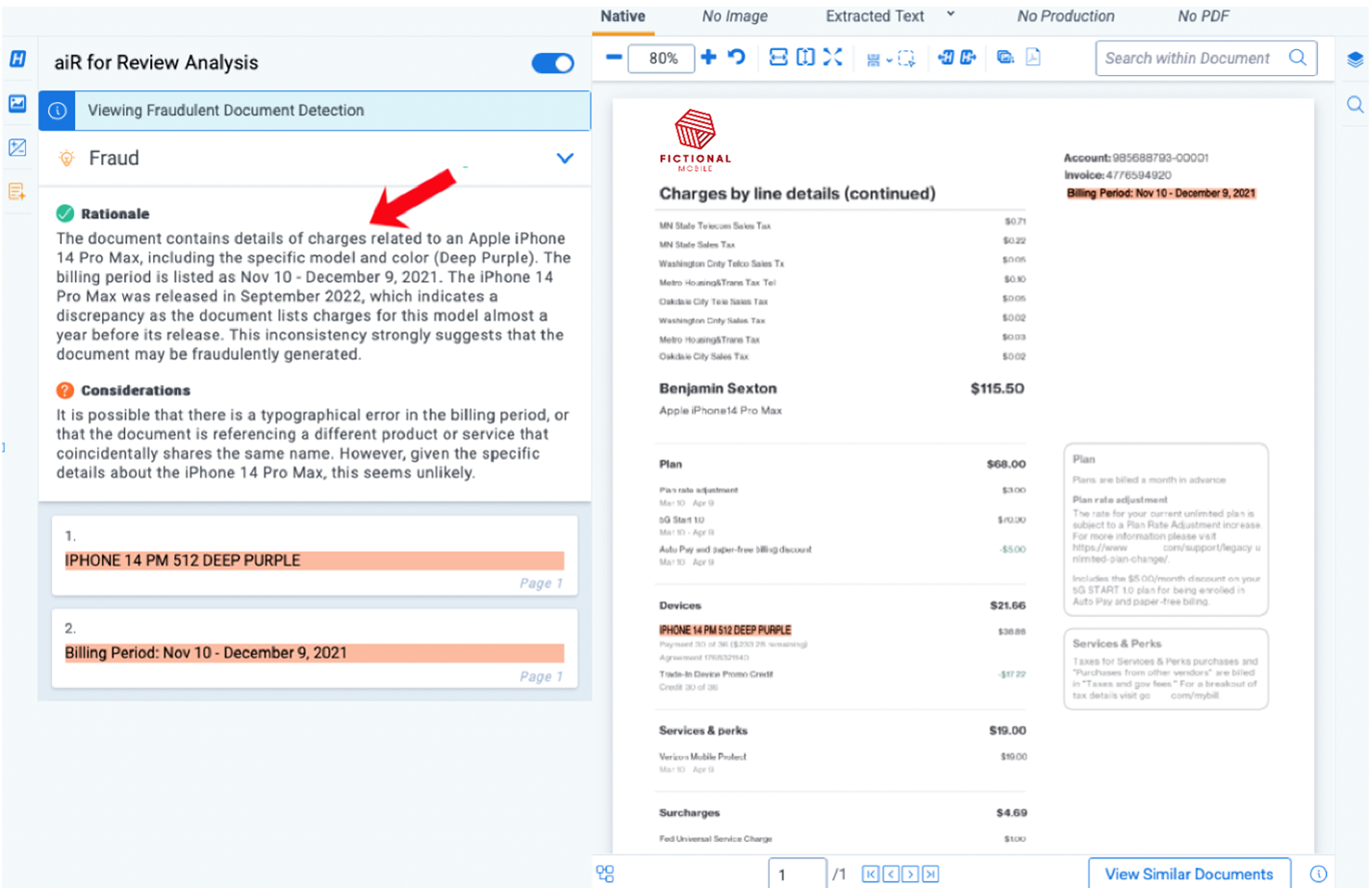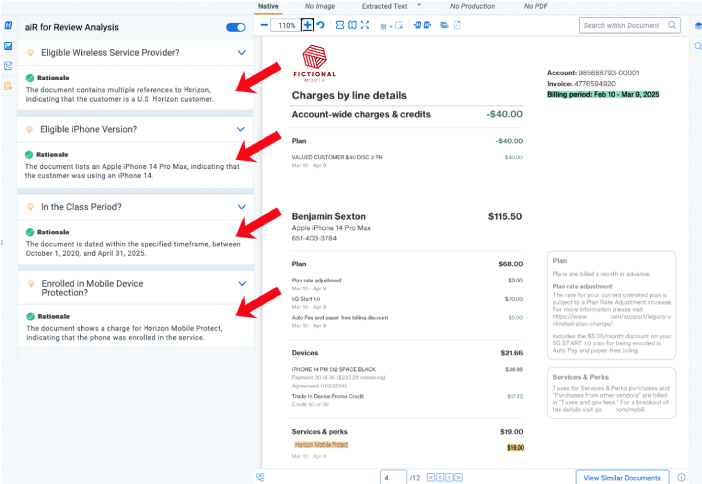 Here, you turn to generative AI to assist with review. These models aren’t just screening for keywords; they’re interpreting documents in context, much like a human reviewer would. The system is prompted with the settlement criteria and asked to assess each uploaded file: Does it include a Mobile Protect line item? Is the billing date within the class period? Does the device listed match an iPhone 12, 13, or 14?